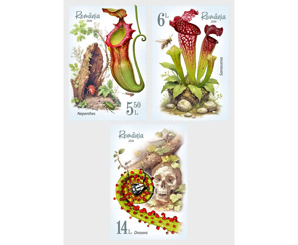 Ngày 21/1/2026, Bưu chính Romania đã chính thức phát hành bộ tem chuyên đề Thực vật – Cây ăn thịt, mang đến cho giới sưu tầm tem và công chúng một góc nhìn sinh động về những loài thực vật đặc biệt trong tự nhiên. Bộ tem gồm 3 mẫu tem và 1 phong bì ngày phát hành đầu tiên (FDC), khắc họa chi tiết cơ chế bắt mồi, quá trình “tiêu hóa” con mồi, đồng thời tôn vinh vẻ đẹp độc đáo của hoa và cấu trúc bẫy của các loài cây ăn thịt.